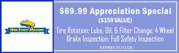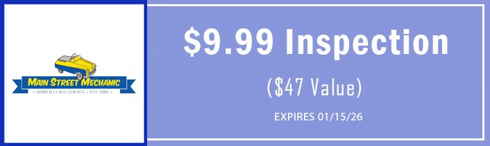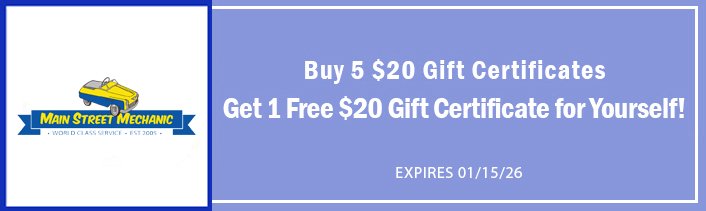 The following specials are only available on the web and are updated monthly! To redeem any of the following coupons, just print off the page and bring the offer(s) that you want to use to the shop along with your vehicle. And remember to check back soon for more money-saving offers from Main Street Mechanic!